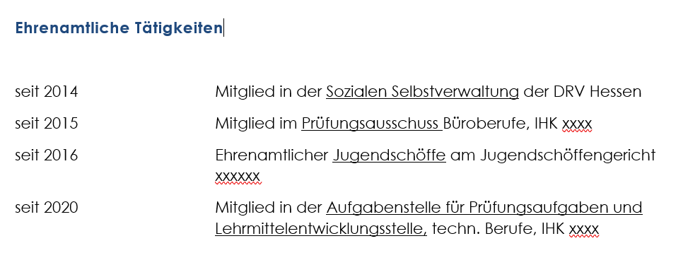 Bei Ehrenämtern möchte der Persoaler (m, w, d) zudem die zeitliche Dauer und die Häufigkeit wissen. Keine Firma möchte jemanden ins Team holen, der einem das Gefühl gibt, mehr Zeit im Ehrenamt, als im Betrieb zu verbringen. Ist man z.B. Mitglied im Gemeinderat seiner Stadt, steht dies für bestimmte Kompetenzen wie Verhandlungsbereitschaft, Finden von Kompromissen und dem Übernehmen von Verantwortung, aber im Gegenzug ist man 1mal pro Monat früher von der Arbeit weg.
