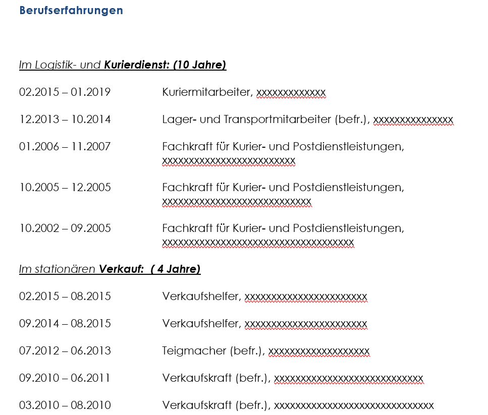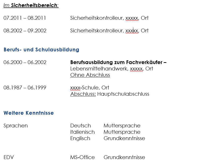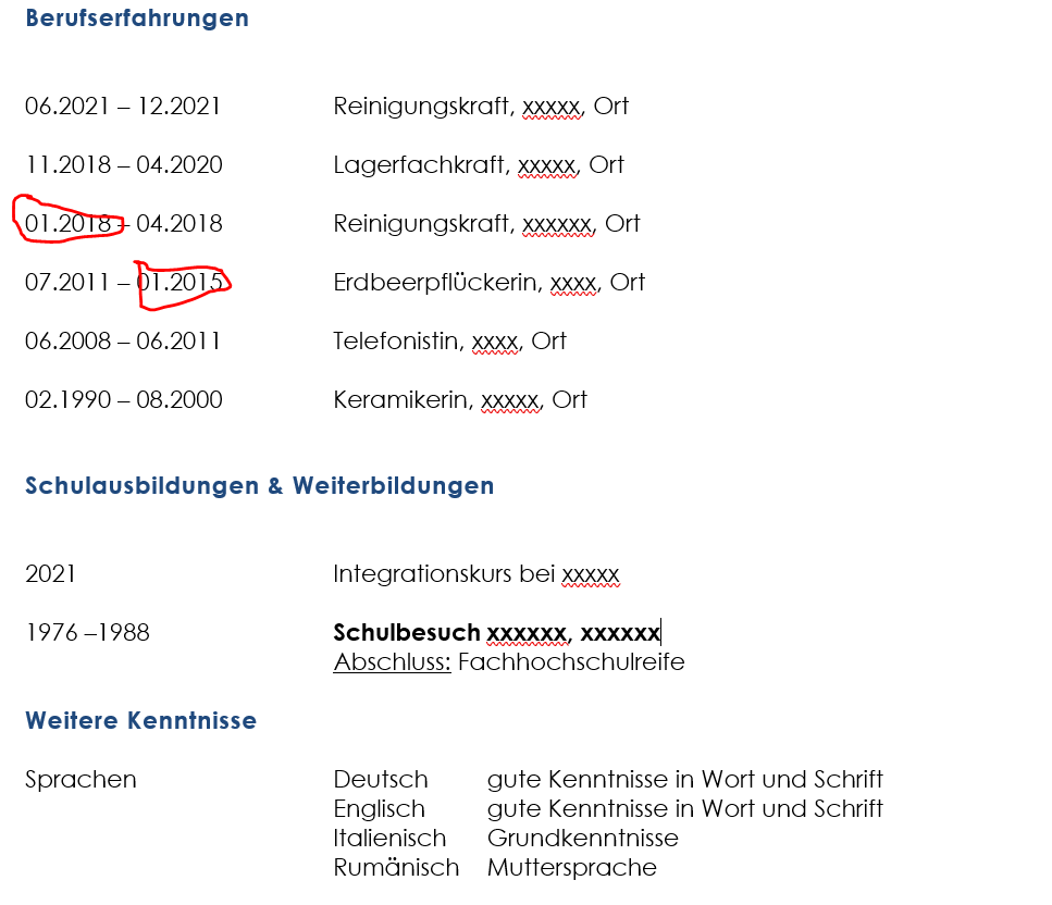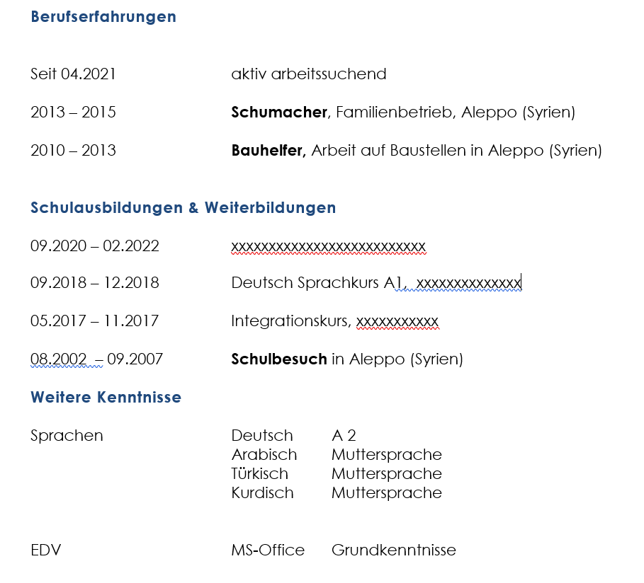 Die Person mit Fluchthintergrund und dem Wunsch nach einer Stelle im Einzelhandel dagegen würde mit einem linearen Lebenslauftyp dagegen viele Personaler verschrecken und sehr viele Fragezeichen entstehen lassen: Wie wird die Flucht eingebaut? Die Phasen der Integration? Soll die Ausbildung im Herkunftsland erwähnt werden, und etwaige Anerkennungsverfahren?
