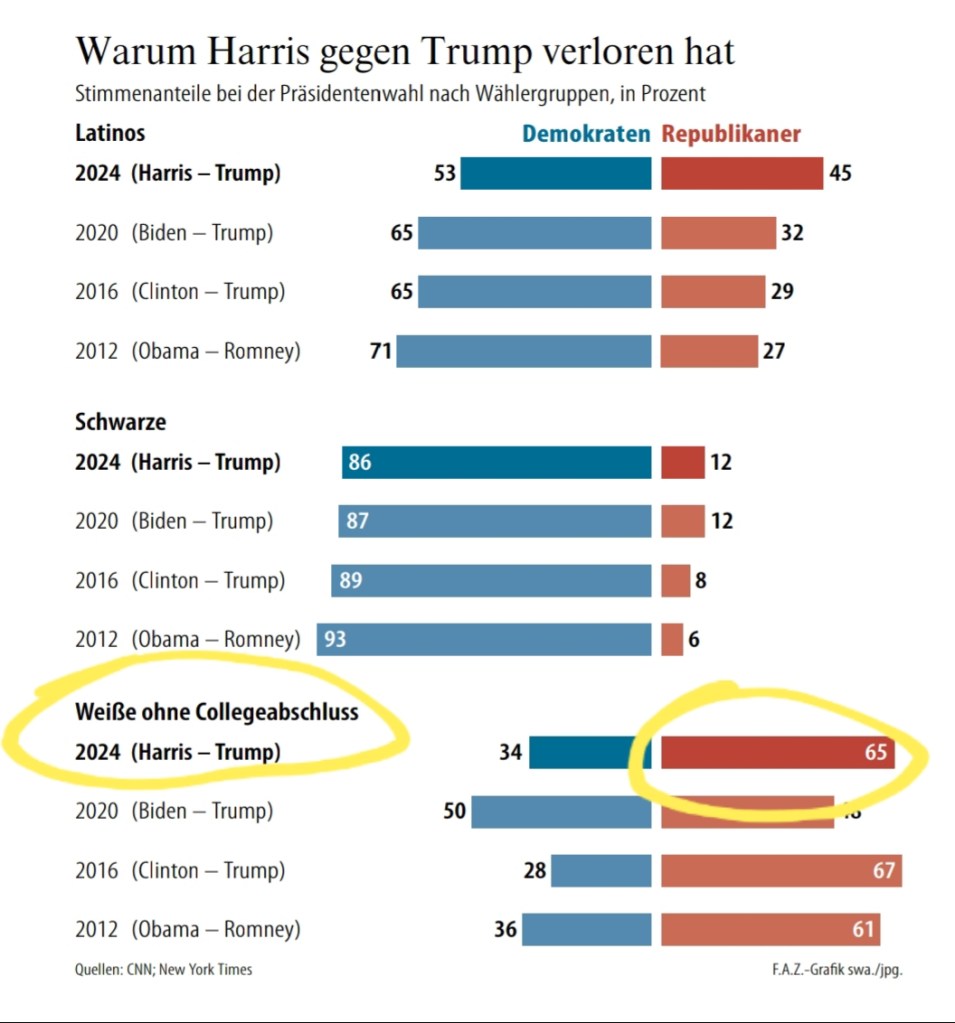 Und das bei sicher geglaubten Demokraten Stammwähler:innen, wie Latinos oder Menschen, ohne Colleg Abschluss. (Quelle: SPIEGEL)