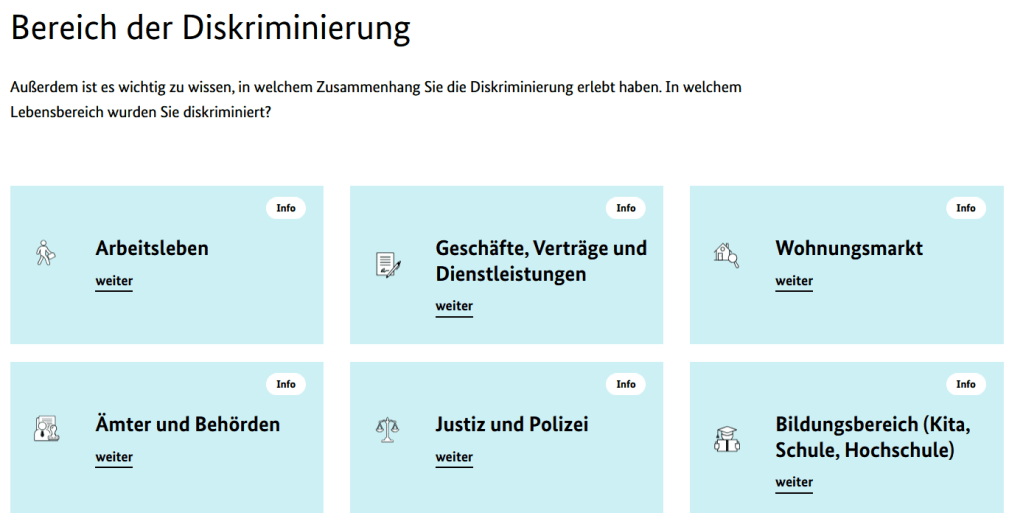 Auf der Website kann man investigativ prüfen wann welcher der 8 AGG-Verstöße genau vorliegt und bekommt dann den Verstoß aufgezeigt.
