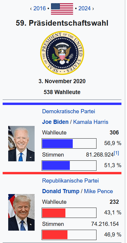 Ausgang der US Wahlen 2020, Trump holte 74 Millionen Stimmen (Quelle: Wikipedia)