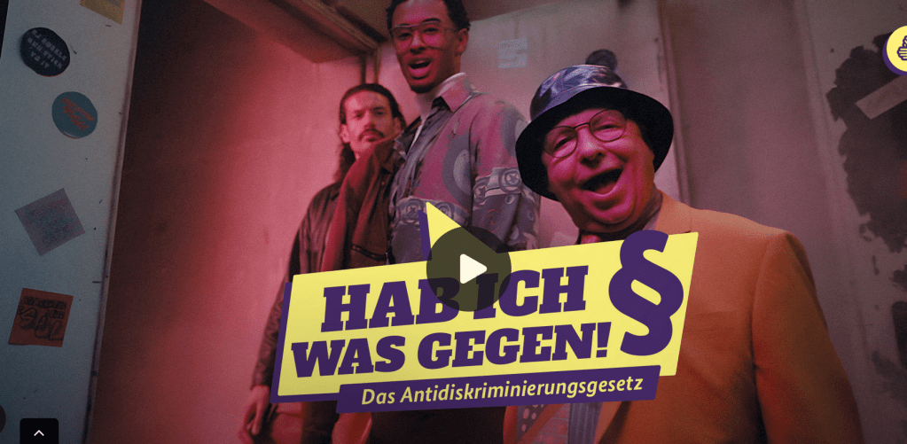 Es gibt sogar eine witzige Image Kampagne der Bundes-Regierung dazu. Hans-Joachim Heist bekannt aus der Heute Show in seiner Rolle als Gerd Hassknecht tritt in knallgelbem Anzug an um zu fetzigen Disco Klängen Menschen mit Diversitätsmerkmalen in alltäglichen Diskriminierungssituationen zu unterstützen. Da ist im Fitnessstudio der junge Mann mit Kippa, der diese ausziehen soll. Der ältere Bewerber welcher auf Grund seines Alters abgelehnt wird. Die Kollegin, welche sexuell Belästigt wird, die taubstumme Kollegin welcher gekündigt wird. Zu Guter letzt einen jungen PoC Mann welchem der Eintritt in dem Club verweigert wird…
