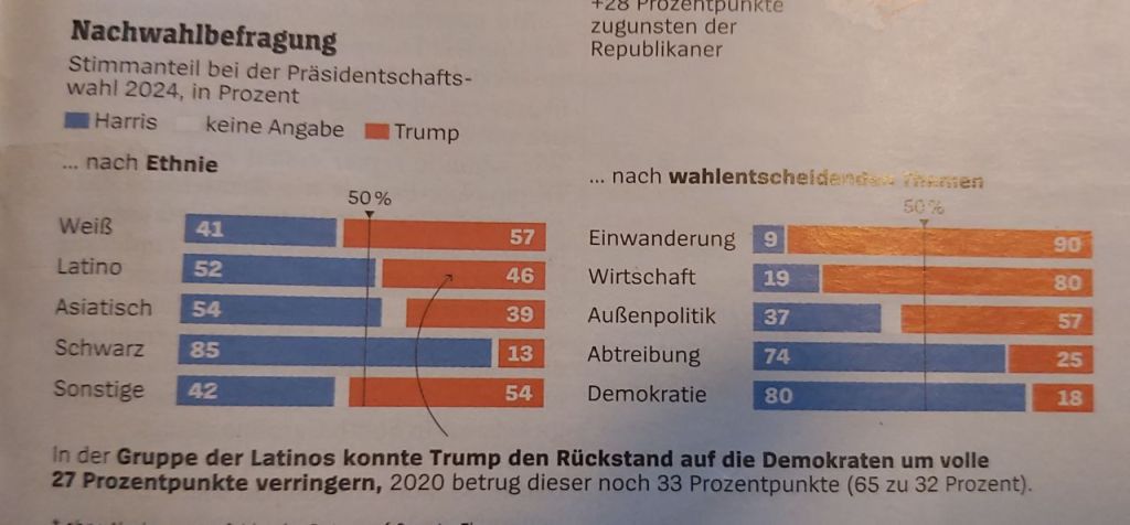 Ebenso der Anstieg von Wähler:innen aus dem Latinospektum von 32% auf 45%, welche eigentlich auf Grund Ihres Merkmals Ethnie zur Stammwählerschaft der Demokraten zählte, wanderte ins Lager der Republikaner.